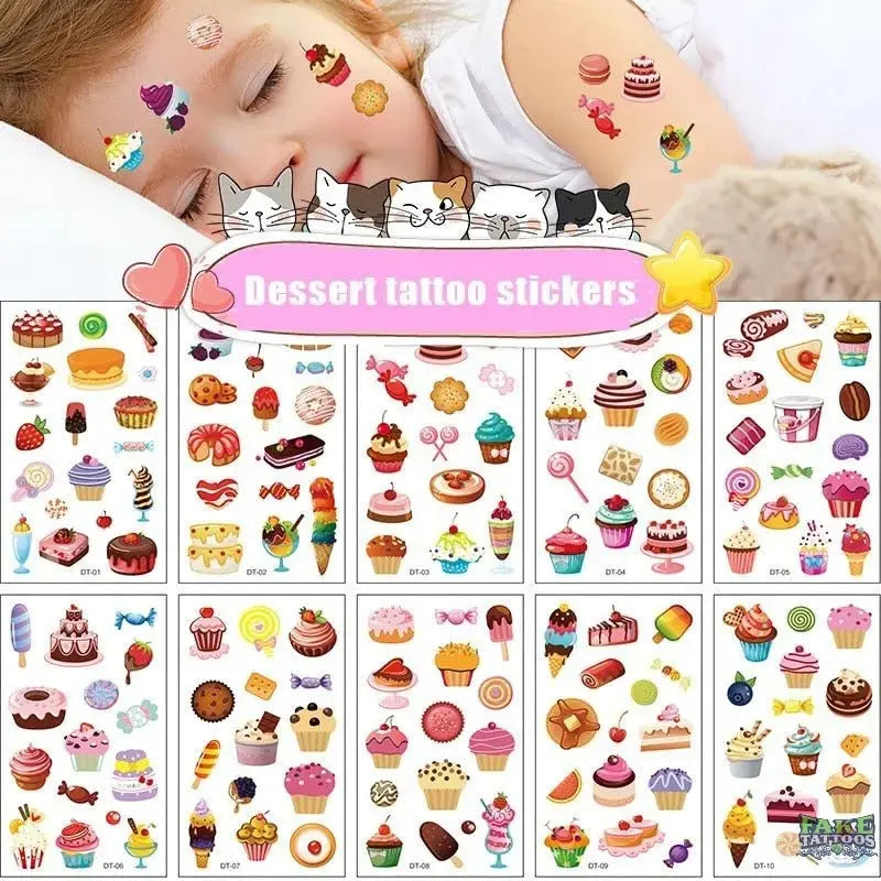 - Safe & Long Lasting Temp Tattoos: These dessert theme temporary tattoos are made of high quality safety paper, Non-allergenic, Non-toxic and totally safe for your kid's skin. Even you can apply on arm, leg, neck, back and face. Simply wet the tattoo with water and stick transferred them onto your body, hands, faces and arm you like, Tattoos will last from 3 to 5 days ,it also can be easily removed with baby oil, makeup remover or rubbing alcohol:)