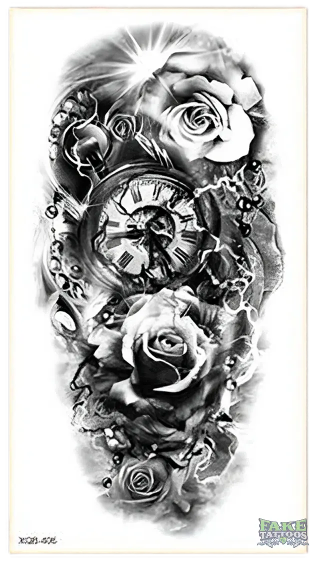 In conclusion, the Clock & Roses Temporary Tattoo is more than just a piece of art; it's a blend of symbolism and beauty that can enhance your appearance and make a statement. It's easy to apply, versatile, and perfect for any occasion, making it an essential addition to your collection of temporary tattoos.