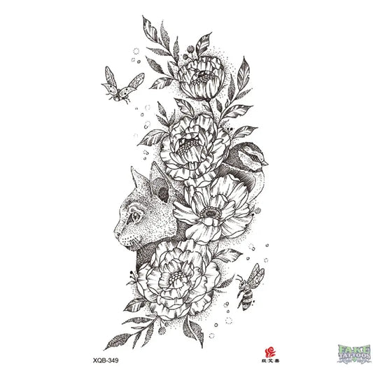 Tatuaje temporal de gato, pájaro, flores, mariposa